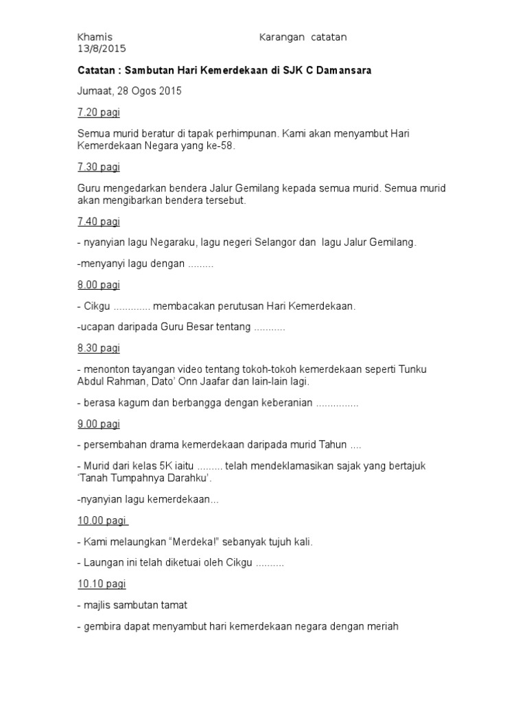 Salah satu kepentingan menyambut hari kemerdekaan di negara kita ialah kita dapat mengenang jasa tokoh yang telah berkorban demi mencapai kemerdekaan untuk tanah air. Hari kemerdekaan negara kita jatuh pada tanggal 31 ogos setiap tahun. Contoh karangan laporan sambutan kemerdekaan peringkat sekolah. Klik di sini untuk informasi file lengkap contoh karangan paragraf induktif tentang hari kemerdekaan indonesia selengkapnya. Setiap tahun negara kita akan mengadakan sambutan hari kemerdekaan negara bagi mengingati detik bersejarah yang amat berharga kepada semua rakyat malaysia. Ayah telah berjanji membawa saya dan adik meraikan hari kebangsaan di dataran merdeka.