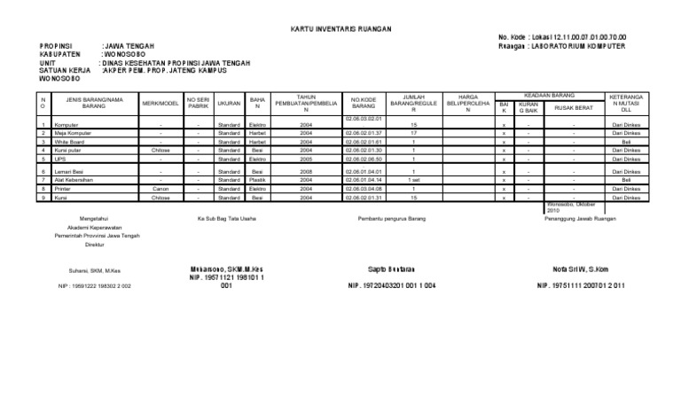 Contoh kartu inventaris barang kantor. Contoh format laporan inventaris barang lengkap ini ditujukan bagi siapa saja yang membutuhkan informasi pendidikan aplikasi dan administrasi untuk digunakan sebagai referensi sesuai keperluan baik itu di lingkungan kelas dan sekolah ataupun umum untuk guru bahkan operator sekolah dan tenaga usaha tu. Contoh laporan inventaris barang kantor sekolah format excel ini merupakan salah satu kewajiban pengelola sarana dan prasarana sekolah untuk melaporkan keadaan sarana prasarana sekolah seperti gedung tanah barang dll. Silahkan anda bisa download format microsoft office excel. Kode barang kib kartu inventaris barang sesuai nomo 17 tahun 2007 keputusan menteri dalam negeri dan sampai sekarang masih berlaku. Download format laporan inventaris barang format excel ini dibagikan secara gratis untuk pengelola aset sekolah jenjang sd smp sma smk ma mts dan mi. Daftar inventaris barang sekolah terdiri dari buku revisi inventaris laporan kib a kib b kib c kib d kib e kartu inventaris ruangan daftar usulan barang berita acara penghapusan barang format laporan inventaris.