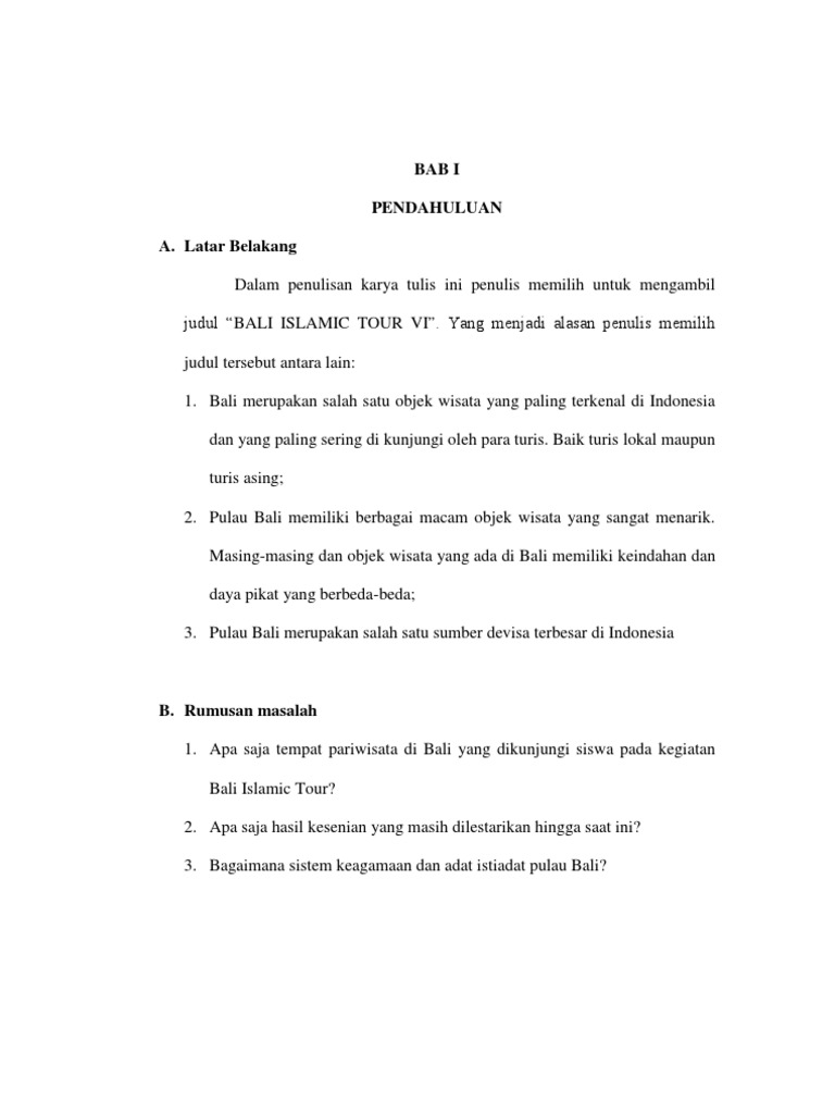 Dari contoh karya tulis berikut di harapkan rekan pelajar semua bisa mendapatkan gambaran mengenai isi dari laporan ini. Contoh karya tulis adalah referensi contoh karya tulis. Makalah laporan karya tulis ilmiah karya ilmiah remaja laporan study tour proposal dan karya tulis lainnya. Karya tulis yang berjudul perjalanan study tour bali pada dasarnya merupakan persyaratan dan tugas akhir di kelas xi semester ii tahun ajaran 20132014 ini karya tulis ini berisikan perjalanan study tour bali yang serta rangkuman keanekaragaman objek wisata yang telah penulis kunjungi di pulau dewata. Contoh format karya tulis tersebut merupakan salah satu penunjang tingkat keberhasilan proses pembelajaran siswa disekolah. Xdlmxdhansheia3 yang meliputi kota kota berikut cirebon yogyakarta semarangdisusun oleh.