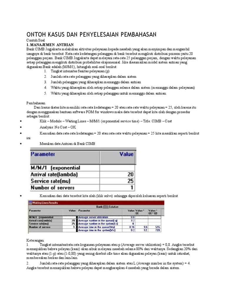 Contoh kasus model antrian. Aturan pelayanannya bersifat fcfs yaitu customer yang datang pertama dilayani terlebih dahulu begitu seterusnya. Bank cimb telah mencoba memasang 5 kasir yang diperlukan untuk melayani para nasabah yang ada di ruang lobby dengan menggunakan sistem mms. K apasitas baik dari kapasitas sistem maupun kapasitas sumber pemanggilan. Poisson distributed arrivals and exponentially distributed service time sebuah perusahaan yang menyewakan furniture mempunyai satu gudang dengan satu mesin. Poisson distributed arrivals and exponentially distributed service time sebuah perusahaan yang menyewakan furniture mempunyai satu gudang dengan satu mesin pengangkut yang dioperasikan oleh satu kelompok yang terdiri dari tiga orang tenaga kerja. 17 desember 2016 1629 unknown.