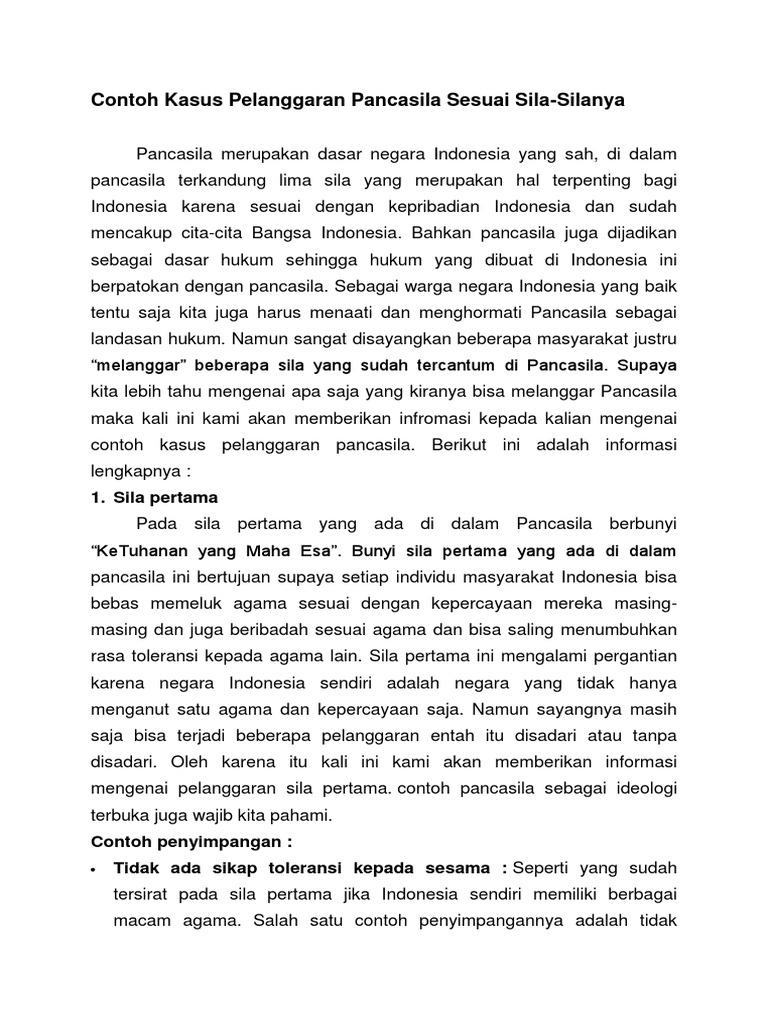 Berikut ini adalah contoh kasus pelanggaran pancasilanya. Peristiwa terorisme tersebut termasuk aksi terbesar di indonesia karena terjadi 3 peristiwa sekaligus. Kedua tempat tersebut terletak saling berseberangan gereja katedral di jalan katedral nomor 7b dan masjid isiqlal di jalam taman. Di indonesia pancasila adalah landasan utama setiap kegiatan pemerintahan maupun landasan masyarakat dalam melaksanakan kegiatan sehari hari. Contoh pelanggaran sila ke 2 di sekolah pancasila adalah dasar negara indonesia yang isinya merupakan lima aturan untuk seluruh warga indonesia. Berikut adalah contoh penyimpangan sila pertama pancasila yang berbunyi ketuhanan yang maha esa.
