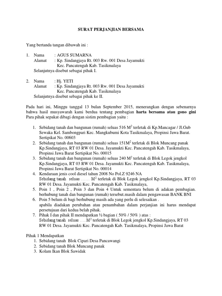 Kali ini saya akan berbagi contoh surat perjanjian pembagian harta bersama atau gono gini. 106575000000 satu miliar enam puluh lima juta tujuh ratus lima puluh rupiah.