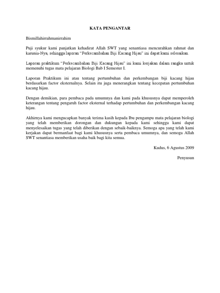 Kompilasi karya ilmiah dan non ilmiah. Contoh kata pengantar laporandalam menyusun laporan baik itu laporan kegiatan umum praktikum observasi dan penelitian atau laporan kerja praktek salah satu yang perlu diperhatikan adalah kata pengantar yang merupakan bagian paling pertama yang berisi resume singkat akan sebuah kegiatan dalam bentuk laporan yang bersangkutan.