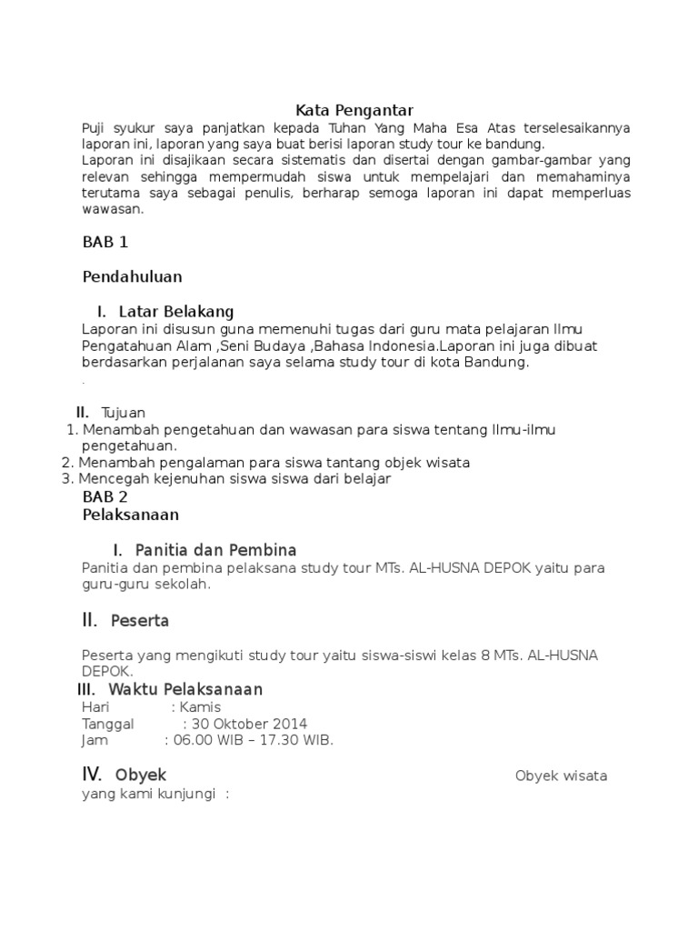Puji syukur kehadirat allah subhanahu wataala yang telah mempergantikan siang dan malam dengan sempurna sehingga kami dapat melaksanakan study tour dengan selamat tanpa ada halangan apapun. Avis mahya ubaidillah 4 deny. Contoh kata pengantar laporan study tour. Contoh kata pengantar laporan bagi mahasiswa dan pelajar membuat kata pengantar untuk tugas laporan adalah hal yang sangat penting. Laporan perjalanan study tour tim capung ke museum ullen sentalu kaliurang sleman 16 september 2016 bab i pendahuluan 1. Sayangnya penulisan kata pengantar kadang dipandang sebelah mata dan dianggap spele bahkan dalam pembuatannya banyak yang masih asal asalan.