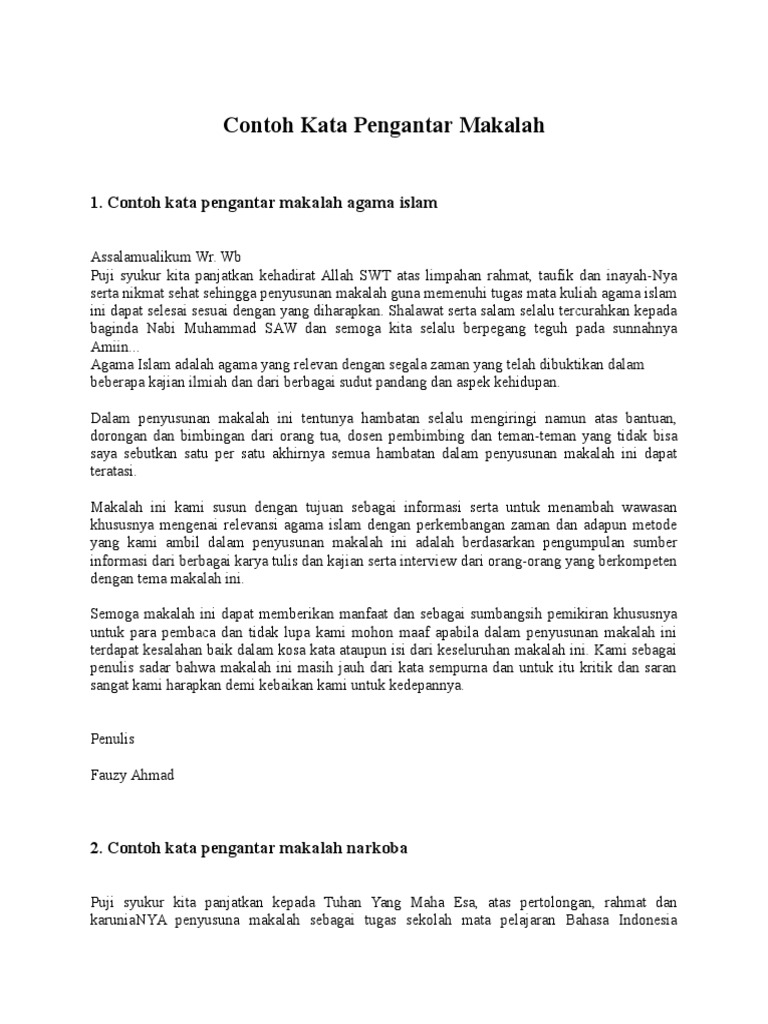 Segala puji hanya milik allah swt. Kata pengantar puji syukur kehadirat tuhan yang maha esa yang telah melimpahkan rahmat dan taufik serta hidayah nya sehingga makalah yang berjudul filsafat agama islam dapat terselesaikan dengan baik. 34 dalam bukunya gelombang ketiga indonesia mengatakan bahwa para ahli sejarah mencatat ada dua gelombang masuknya islam di nusantara yaitu abad ke 7 dan abad ke 13. Segala puji hanya milik allah swt. Sedangkan kesultanan samudera pasai yang didirikan pada 1275 m atau abad ke 13 m bukan awal masuknya agama islam melainkan perkembangan agama islam. Contoh kata pengantar makalah agama berikut ini beberapa contoh kata pengantar dalam suatu makalah agama islamcontoh kata pengantar yang tercantum dalam artikel ini bersifat umum maka penulisan kata pengantar makalah bisa dikembangkan dan disesuaikan dengan tema ataupun topik makalah pendidikan agama yang telah ditugaskan dari dosen atau guru.