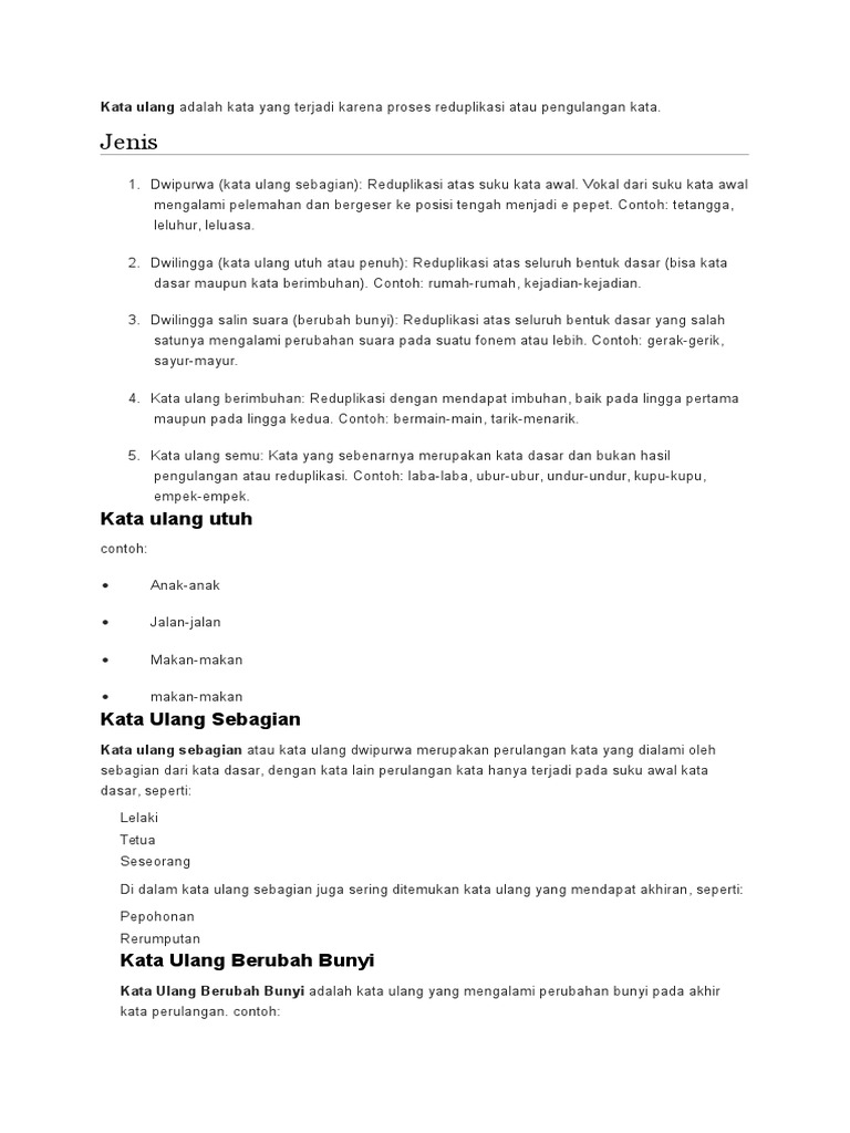 Contoh lauk pauk serta merta warna warni gerak gerik mondar mandir kata ulang suku awal atau dwipurwa yaitubentuk pengulangan suku pertama katadasarnya biasanya disertai variasi e pepet. Dwilingga kata ulang utuh atau penuh. Kata ulang berubah bunyi atau bervariasifonem baik vokal maupun konsonan. Adalah karakteristik dari jenis reset kata ini. Jenis jenis kata ini juga mempunyai jenis jenisnya sendiri baik yang berdasarkan bentuk katanya maupun contoh makna kata di dalamnya. Kata ulang berubah bunyi.