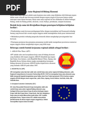 Ini karena kerja sama internasional tentang masalah yang terkait dengan stabilitas negara sedang dibahas. Pada kesempatan ini kita akan berfokus kepada pembahasan mengenai contoh adanya kerja sama antar regional di bidang ekonomi baik yang dilakukan oleh negara kita atau negara lain. Berikut ini adalah contoh beberapa kerjasama regional baik yang ada di kawasan asia dan kawasan eropa. Asean association of southeast asian nations contoh kerjasama antar regional yang pertama dan indonesia sebagai pelopornya adalah asean. Pada tahun 1967 kerja sama tadi berkembang menjadi masyarakat ekonomi eropa mee yang terdiri atas enam anggota. Asean asean association of southeast asian nations atau perhimpunan bangsa bangsa asia tenggara perbara.
