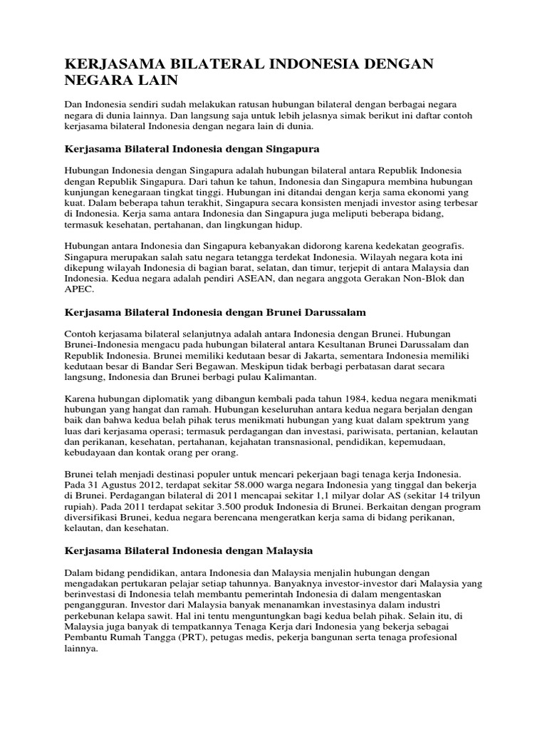 Contoh kerjasama indonesia dengan negara lain. Contoh kerjasama bilateral indonesia dengan negara negara lainnya di dunia ini sangatlah banyak. Adapun pengertian kerjasama bilateral adalah hubungan kerjasama yang dilakukan oleh 2 dua negara. Kerjasama bilateral akan memberi keuntungan bagi dua negara yang terlibat. Contoh kerjasama bilateral indonesia merupakan negara yang aktif dalam menjalin kerjasama bilateral dengan negara lain. Kerjasama bilateral bisa dibilang merupakan kerjasama internasional paling umum dilakukan setiap negara negara di dunia. 1252 milyar yen bantuan hibah.