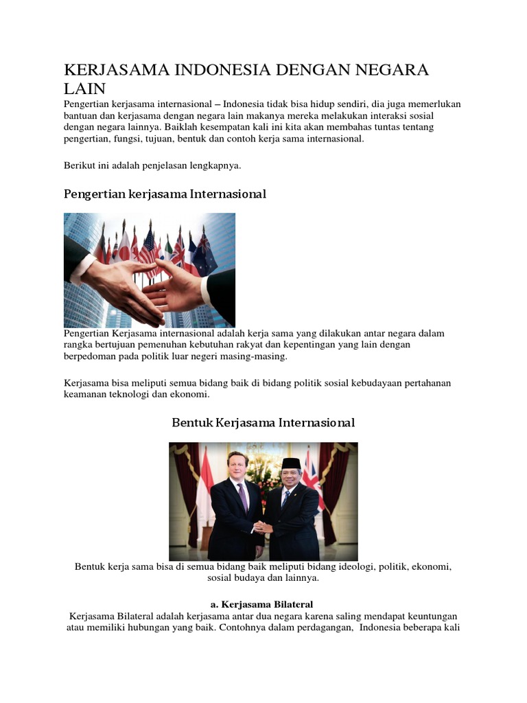 Contoh kerjasama multilateral indonesia. Mengenai kerjasama multilateral ini telah kita ketahui sebelumnya yakni sebagai kerjasama yang dilakukan beberapa negara dimana jumlahnya lebih dari dua negara. Contoh kerjasama multilateral indonesia. Pengertian kerjasama internasional kerja sama internasional adalah bentuk hubungan yang dilakukan oleh suatu negara dengan negara lain yang bertujuan untuk memenuhi kebutuhan rakyat dan untuk kepentingan negara negara di dunia. Kerjasama multilateral juga mempunyai aturan untuk anggotanya. Pemerintah indonesia sendiri telah menandatangani perjanjian perdagangan dan ekonomi di kawasan asia pasifik dengan 14 negara di afrika dan timur tengah dengan 10 negara di eropa timur dengan 9 negara di eropa barat dengan 12 negara dan di amerika latin dengan 7 negara. Kerjasama indonesia dengan jepang merealisasikan fta pada tahun 2005.