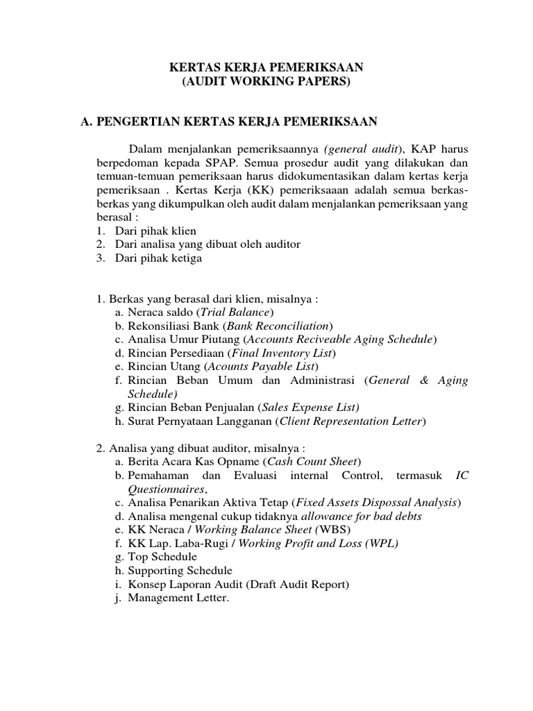 Selain itu kertas kerja juga merupakan bukti pendukung utama yang memungkinkan auditor membela diri apabila hasil kerjanya dipermasalahkan dikemudian hari. Bahasa yg digunakan indonesia atau inggris harus baik d. Kertas kerja audit audit paperwork adalah mata rantai yang menghubungkan antara catatan klien auditor dengan laporan auditsehingga kertas kerja adalah alat yang sangat penting dalam melaksanakan profesi auditor. Kertas kerja audit adalah kertas yang mendokumentasikan bukti yang dikumpulkan oleh auditor untuk menunjukkan pekerjaan yang mereka lakukan metode dan prosedur yang mereka telah mengikuti dan kesimpulan yang mereka. Oleh itu saya kongsikan kat sini sumber yang anda boleh pergi untuk dapatkan contoh kertas kerja perniagaan yang lengkap. Jika anda tak sabar nak tengok apa yang ada.