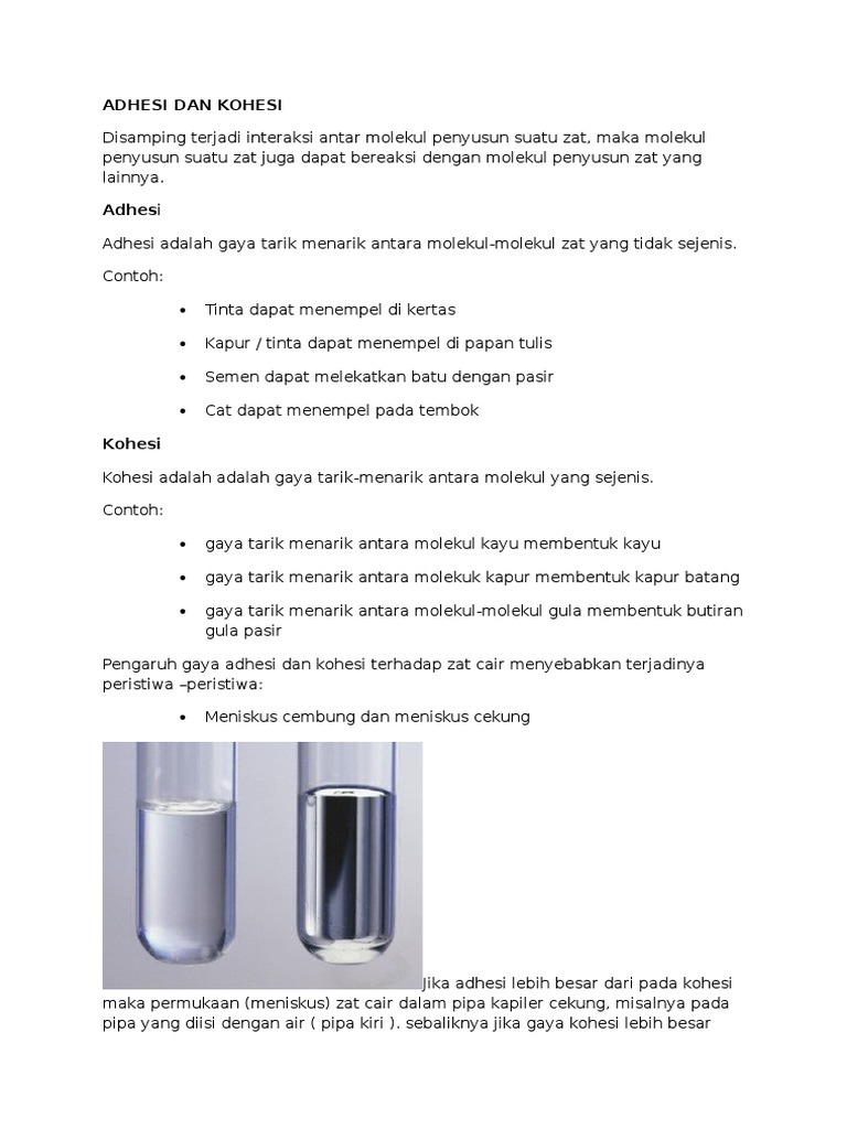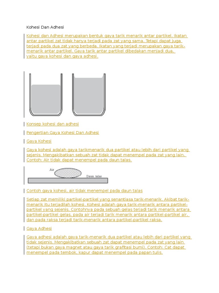 Contoh kohesi dan adhesi. Mari kita bahas selengkapnya. Gaya kohesi adalah gaya tarikmenarik dua partikel atau lebih dari partikel yang sejenis. Contoh peristiwa kohesi adalah. Apabila gaya adhesi ini lebih besar daripada gaya kohesi maka yang terjadi kedua zat akan saling menempel. Ada 3 hal peristiwa unik yang terjadi akibat dari adanya kedua jenis gaya tarik menarik partikel tersebut. Air tidak dapat menempel pada daun talas.