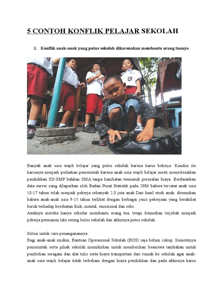 Contoh konflik di sekolah. Jadi kita dapat mendefinisikan konflik conflict sebagai sebuah proses yang dimulai ketika suatu pihak memiliki persepsi bahwa pihak lain telah memengaruhi secara negatif sesuatu yang menjadi kepedulian atau kepentingan pihak pertama. Keadaan atau perilaku yang bertentangan pickering 2001. Contoh konflik di sekolah memang banyak ditemui misalnya konflik antar siswa antar kelas konflik antar guru dengan murid dan masih ada yang lainnya. Penanaman sikap toleransi harus ditanamkan sejak dini lewat sekolah dengan contoh contoh kecil. Konflik yang terjadi tersebut pastinya harus kita selesaikan atau kita tangani baik secara baik seperti melalui perdamaian ataupun dengan jalan yang kurang baik. Posting pada sd ditag 2 contoh konflik yang bersifat konstruktif apa perbedaan antara kekerasan dan konflik apa sajakah dampak positif konflik sosial apa yang dimaksud dengan peran ideal artikel konflik lokal artikel konflik sosial artikel konflik sosial di indonesia 2018 bentuk bentuk konflik berita tentang kelompok sosial cara.