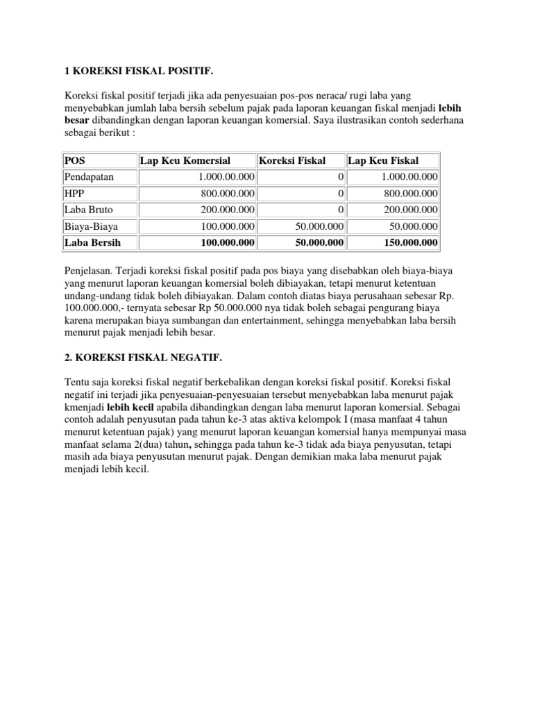 Contoh koreksi fiskal positif dan negatif. 36 tentang pph koreksi fiskal dibedakan menjadi dua yaitu koreksi positif dan koreksi negatif. Lebih baik untuk berurutan. Dengan demikian untuk keperluan perpajakan wajib pajak tidak perlu membuat pembukuan ganda melainkan cukup membuat satu pembukuan berdasarkan standar akuntansi keuangan sak dan pada waktu mengisi spt tahunan pph terlebih dahulu harus dilakukan. Koreksi fiskal ada dua macam yakni koreksi fiskal positif dan koreksi fiskal negatif. Sedangkan koreksi fiskal negatif adalah perbaikan yang dilakukan justru hasilnya mengurangi jumlah biaya pajak. Pada umumnya terdapat dua jenis koreksi fiskal yaitu koreksi positif dan koreksi negatif.