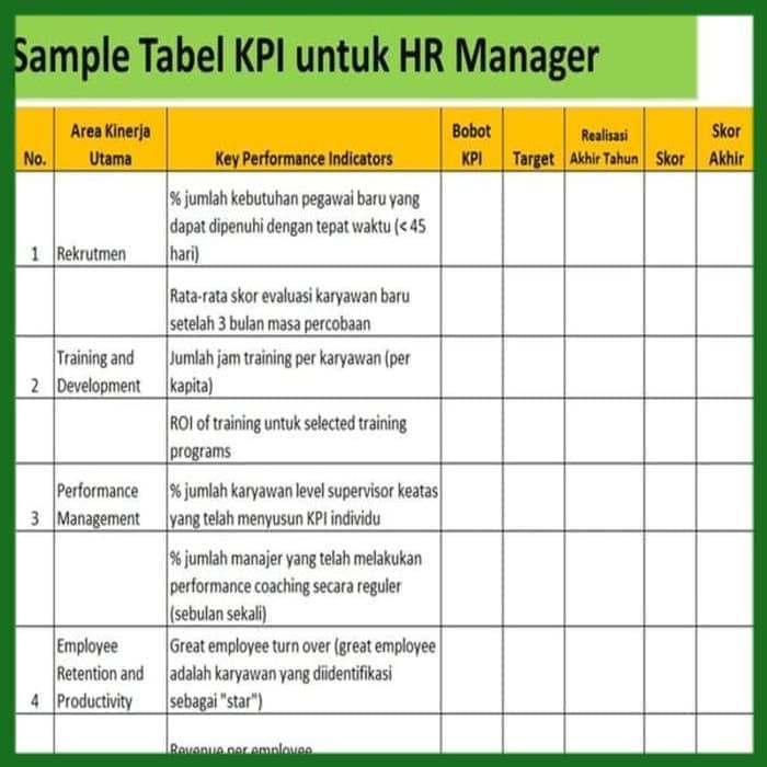 Karena untuk membuat sebuah kpi pertama kali anda sebagai manager perlu kerja bareng secara langsung dengan karyawan anda. Template untuk reimburse dinas luar kota ini meliputi biaya akomodasi perjalanan dan makan. Disajikan juga cara menghitung skor pencapaian kpi. Di sebelah kanan tulis tugas harian yang harus dikerjakan oleh karyawan anda. Manajer hrd area kinerja bobot no. Contoh kpi yang bersifat kualitatif di atas masih dapat diusahakan agar memiliki aspek kuantitatif.