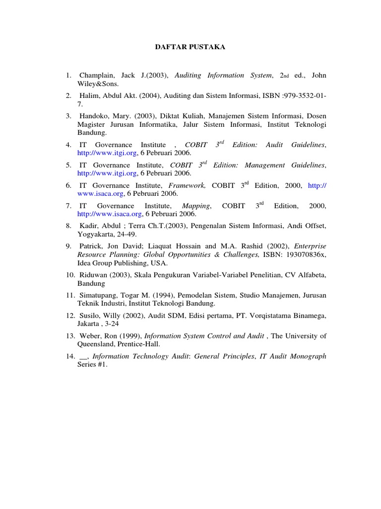 Sebelum menjawab setiap pertanyaan pernyataan mohon dibaca terlebih dahulu. Abstrak cobit dikembangkan oleh isaca information system and control association dan itgi it governance institute yang merupakan organisasi non profit yang bergerak di bidang tata kelola ti. Untu audit keuangan akuntansi manajemen keuangan akuntansi pemerintahan akuntansi sistem informasi akuntansi perpajakan akuntansi perilaku akuntansi perbankan dan masih banyak lagi. 38 internal audit pada perusahaan berjalan dengan efektif. Berdasarkan proses audit yang telah dilakukan maka dapat disimpulkan bahwa hasil dari rekapitulasi tingkat model capability skala penelitian audit tata kelola teknologi informasi di dinas komunikasi dan informatika kabupaten oku yaitu skala 3 established process dengan nilai 318 yang artinya dinas komunikasi dan informatika kabupaten oku ini sudah mengimplementasikan tata kelola teknologi. Audit ti indonesia dalam rangka pelaksanaan penugasan jasa audit it pgnperusahaan gas negara initerkait dengan hal tersebut pt.