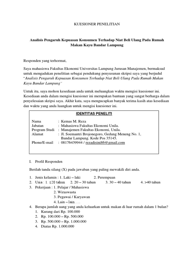 Contoh kuesioner di google form cara membuat tahukah kamu bahwa saat ini teknologi semakin maju. Contoh kuesioner penelitian tentang kepuasan pelanggan. Pengertian kuesioner angket kuesioner adalah suatu daftar pertanyaan yang harus di isi oleh responden sebagai sarana untuk mengumpulkan informasi tentang perilaku karakteristik keyakinan dan sikap sekelompok orang atau organisasi. Contoh kuesioner kuesioner merupakan sebuah cara bagi seseorang yang ingin mengumpulkan informasi tentang suatu hal yang bersumber dari banyak orang. Sebuah kuesioner tidak akan menjadi bermanfaat jika pertanyaan yang ditujukan tidak tepat sasaran. Kuesioner ini dibagi menjadi empat bagian yaitu identitas responden kuesioner kepuasan pelanggan kuesioner proses bisnis internal dan kuesioner pertumbuhan dan pembelajaran.