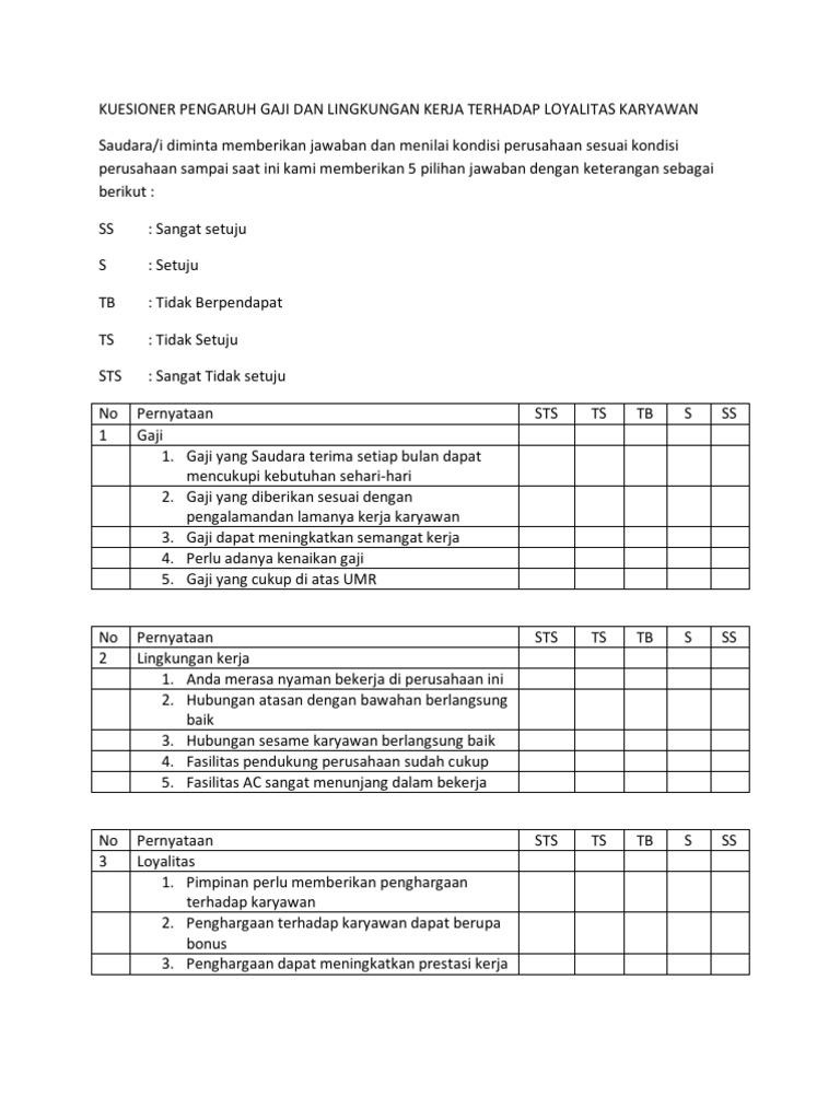 Kuesioner pengaruh gaji dan lingkungan kerja terhadap loyalitas karyawan kuesioner disiplin kerja 2 pengaruh kompensasi terhadap kinerja karyawan study pada ptpln persero upk ring sulawesi 3. Ss skor 5 sangat sering. Pertanyaan pertanyaan dalam survei evaluasi kinerja karyawan ini bertujuan untuk memudahkan manajer dan supervisor dalam memberikan feedback langsung terhadap aspek kerja yang spesifik pada karyawan termasuk area peningkatan kebutuhan pelatihan tambahan area untuk kinerja khusus dan perkiraan kinerja di masa yang akan datang. Kuesioner kinerja karyawan model chester i. Nah itulah contoh kuesioner yang baik dan benar. Kuesioner kuisioner penelitian.