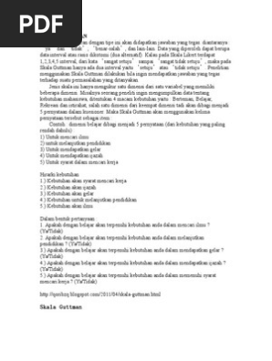 Academiaedu is a platform for academics to share research papers. Apabila responden mengiyakan pernyataan yang berbobot yang lebih berat ia akan mengiyakan pernyataan yang kurang berbobot lainnya terdiri dari beberapa pertanyaan yang diurutkan secara hierarkis skala guttman digunakan untuk jawaban yang bersifat jelas dan tegas contoh. Setipa metode skala tersebut memiliki keunggulan dan kelemahan tersendiri. Skala thrustone skala rating skala diferensial semantik skala guutman atau skala likert. Data berupa kuesioner tersebut dapat diolah dengan menggunakan metode penghitungan tertentu antara lain. Kuesioner sebagai salah satu instrumen yang digunakan untuk mengumpulan informasidata penelitian memiliki berbagai macam skala pengukurannya.