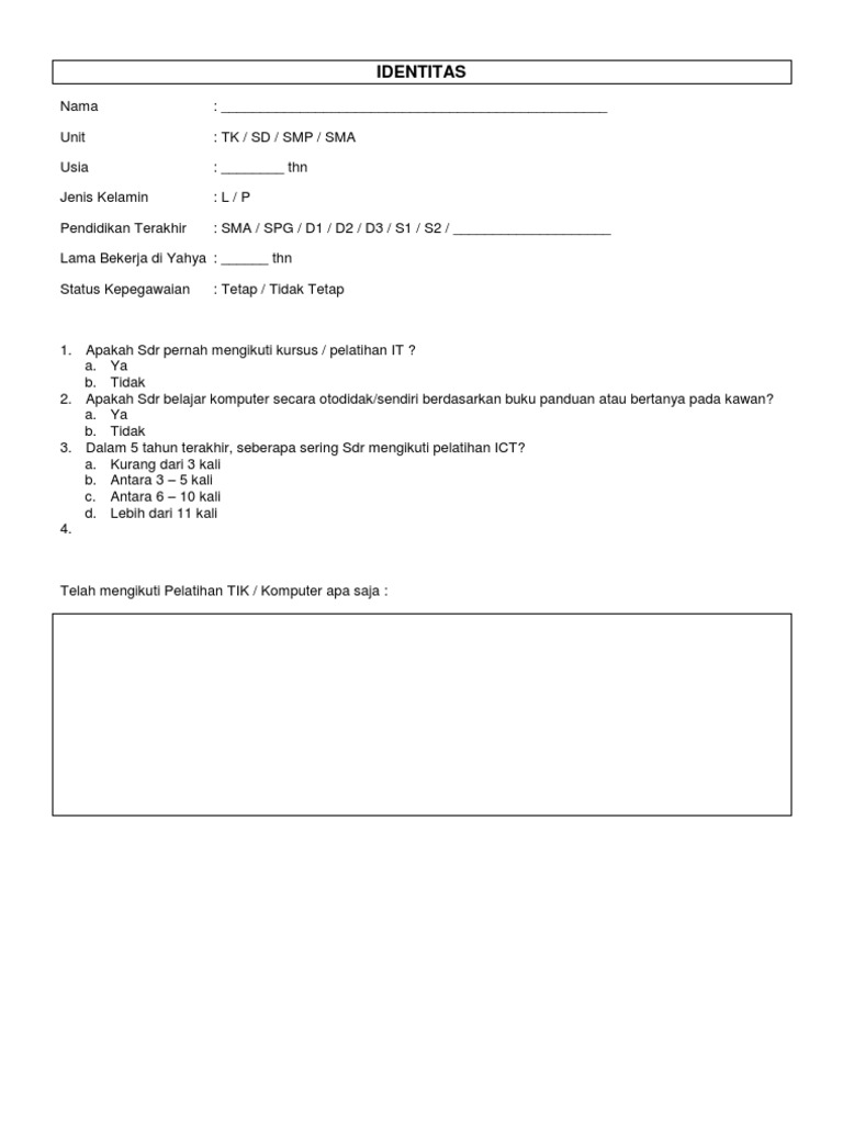 Contoh kuesioner pelatihan dan pengembangan. Contoh kuesioner penelitian doc. Di kutip dari beberapa sumber. Tanggapan bapakibu akan sangat bermanfaat sebagai bahan evaluasi dan pertimbangan dalam menyusun rencana pelatihan tahun berikutnya. Tingkat ketersediaan fasilitas penunjang program pelatihan 11. Terima kasih atas bantuan dan kerja sama bapakibu. Demikian ulasan mengenai contoh kuesioner sekaligus berbagai penjelasan lengkapnya.