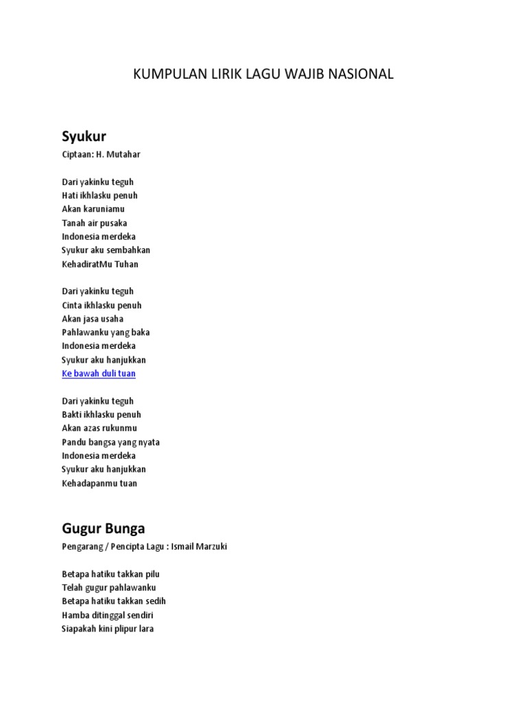 Nah untuk kesempatan kali ini akan kita bahas bersama sama lagi mengenai lagu wajib nasional dengan lengkap. Banyak anak muda dan aktivis seni selama masa perjuangan yang menciptakan berbagai jenis lagu nasional indonesia untuk memperkuat rasa perjuangan mereka dan untuk lebih mengekspresikan kemerdekaan. Lagu wajib nasional merupakan lagu nasionallagu perjuangan yang wajib diajarkan oleh guru kepada siswapelajar pada tingkat pendidikan dasarhal ini menjadi sangat penting karena dengan adanya siswapelajar dididik untuk menghafal dan memahami lagu wajib nasional maka akan dapat bermanfaat untuk. 125 lagu wajib nasional. Kumpulan lagu wajib nasional pada bab sebelumnya kita telah bahas bersama sama mengenai makna dan arti lambang pancasila secara mendetail. Kirana dilla chandra 2015.