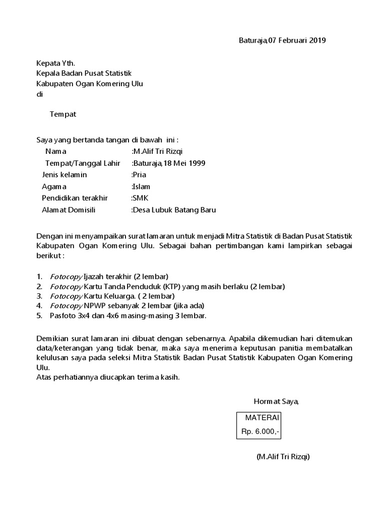 Tips menulis surat lamaran kerja yang efektif. Apalagi perusahaan yang kamu lamar adalah perusahaan besar ini menunjukkan etika kamu. Contoh surat lamaran kerja 2019 terbaru bagi seseorang yang ingin bekerja pada suatu perusahaan pasti akan mendaftarkan diri dengan membuat persyaratan tertentu agar kemungkinan besar diterima pada perusahaan tersebut yang salah satunya adalah surat lamaran kerja. Wonosobo 30 oktober 1994. Tetapi banyak sekali diantara kita yang tidak tahu bagaimana cara membuat surat lamaran kerja yang baik agar kemungkinan. Contoh surat lamaran kerja melamar sebuah pekerjaan merupakan suatu hal yang umum terjadi pada kehidupan kita sehari hari.