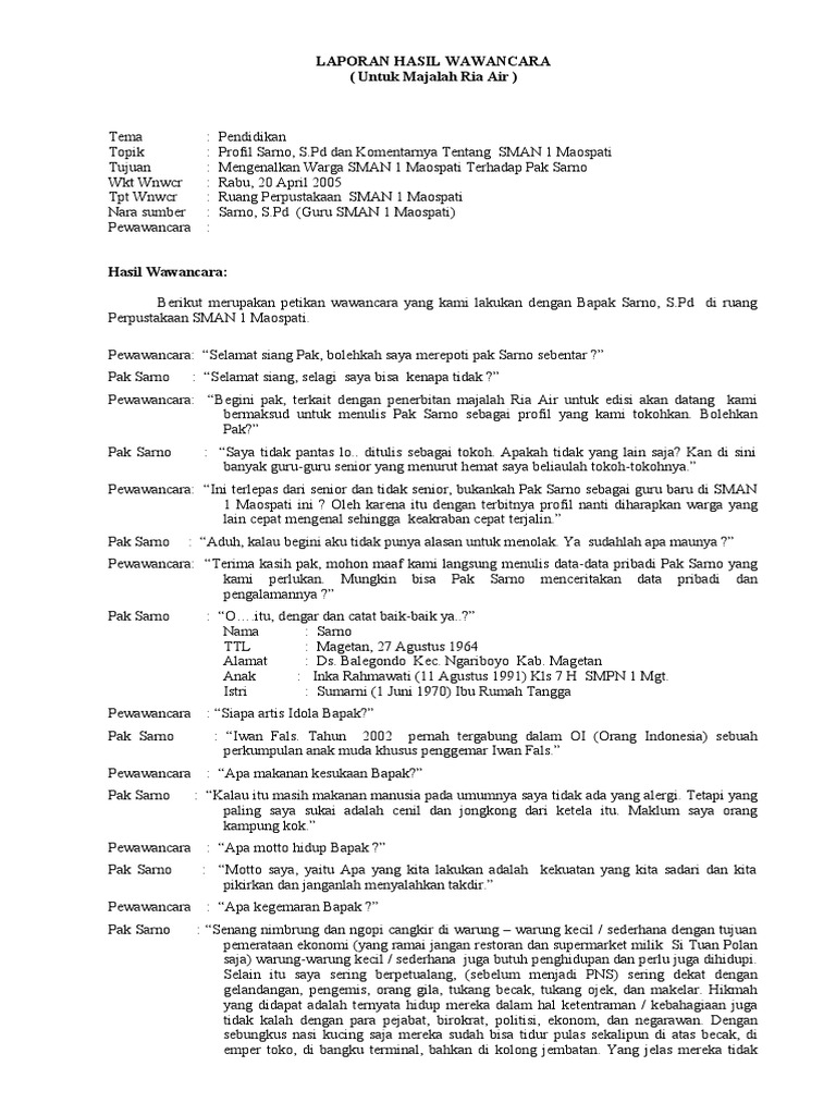 Contoh laporan hasil wawancara. Sma negeri 1 maos tahun pelajaran 20152016. Puji syukur atas kehadirat tuhan yang maha esa. Download file format doc atau docx microsoft word. Demikianlah laporan hasil kegiatan wawancara ini kami buat dengan yang sebenar benarnya. Isi makalah membahas tentang wawancara dengan seorang pedagang roti atau pengusaha roti tentang bagaimana kegiatan produksi penjualan usahanya serta pembahasan lainnya. Wawancara diperlukan untuk mendapatkan informasi dari narasumber tentunya hasil wawancara yang baik harus di lampirkan dalam bentuk laporan dengan tujuan mempermudah untuk memahami hasil dari wawancara tersebut berikut contoh laporan hasil wawancara terhadap anak usia sd dengan tujuan untuk mengetahui sejauh mana daya simak anak terhadap metode yang disampaikan.
