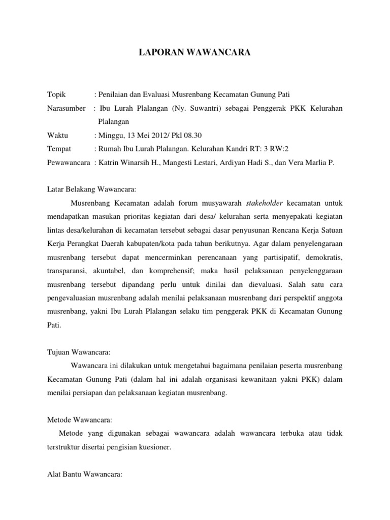 Contoh laporan hasil wawancara laporan hasil wawancara adalah sebuah teks tertulis yang melaporkan suatu wawancara yang telah dilakukan baik itu wawancara dengan pedagang pengusaha guru ketua rt. Laporan hasil wawancara dari wawancara yang telah dilakukan di atas dapat disusun laporan hasil wawancara dalam bentuk narasi atau cerita seperti. Academiaedu is a platform for academics to share research papers. Saya telah melakukan wawancara dengan pak somad pada hari kamis 20 januari 2011 jam 1030 sampai jam 1100 wita di rumah pak somad. Ucapan terima kasih tertuju kepada tuhan yang maha esa yang telah memberikan kemudahan kepada kami sehingga terlaksananya acara ini. Contoh laporan hasil wawancara.