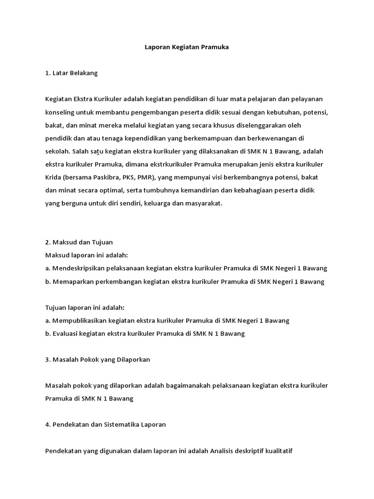 Contoh laporan singkat kegiatan jika kita bekerja pada sebuah institusi atau berorganisasi di sekolah setiap kegiatan yang diselenggarakan baik itu kegiatan pelatihan bakti sosial pramuka lomba 17 agustus dan acara acara lainnya pasti selalu dimintai pertanggungjawabannya entah itu berupa laporan tertulis ataupun dokumentasi berupa foto. Laporan pelaksanaan kegiatan ekstra kurikuler pramuka smk negeri 1 bawang tahun 20062007 a. Demikianlah laporan kegiatan lomba tangkas pramuka yang menjadi tanggung jawab kami sebagai penyelenggara lomba dan hasil kegiatan lomba yang telah dilaksanakan. Pengertian ekstrakurikuler secara etimologi berasal dari dua kata yaitu ekstra yang berarti tambahan dan kurikuler yang berarti rencana susunan rencana pelajaran.