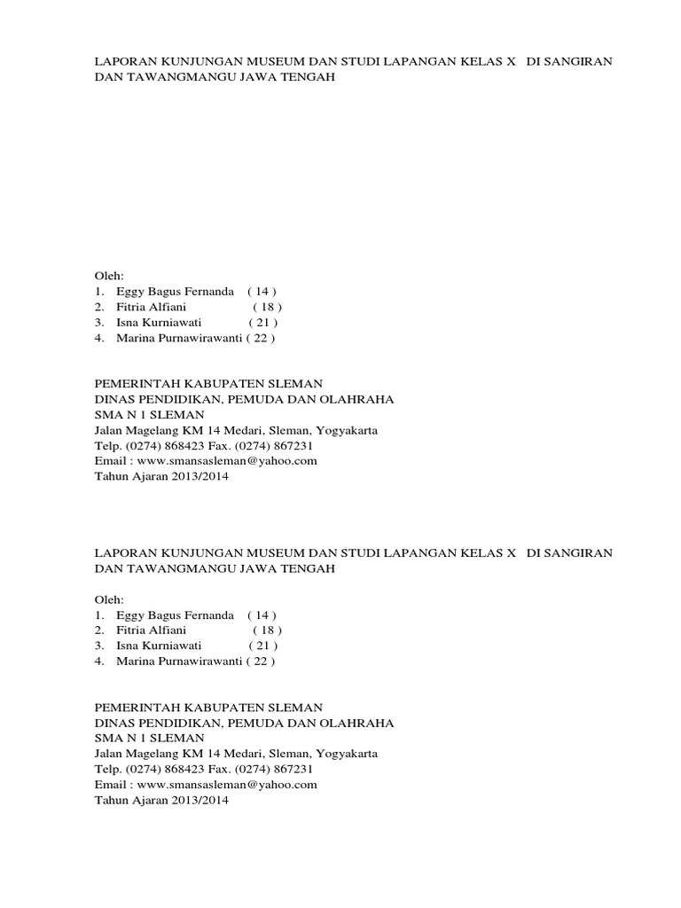 Contoh karya tulis kunjungan museum digantara by adminbloganakasemka kamis 09 november 2017 add comment materi sekolah laporan hasil kunjungan. Demikian contoh laporan kunjungan museum semoga dapat bermanfaat bagi kita semua. Ahmad 2 juni 2020. Contoh laporan kunjungan ke museum jumat 30 januari 2015. Contoh laporan kunjungan museum laporan kunjungan museum dan studi lapangan kelas x di sangiran dan tawangmangu jawa tengah. Pengertian struktur kaidah teks cerita ulang.
