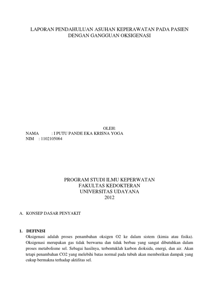 Contoh laporan pendahuluan oksigenasi. Di ruang kenanga rsud goetheng tarunadibrata. Defenisi oksigen adalah salah satu komponen gas dan unsur vital dalam proses metabolisme untuk mempertahankan kelangsungan hidup seluruh sel sel tubuh tarwoto dan wartonah 2006. 3 perkusi dari puncak paru ke bawah supraskapularis 3 4 jari dari pundak sampai dengan torakal 10. Pada pasien obstruksi dipsneu. Laporan pendahuluan chf congestive heart failure a. Oksigenasi adalah pemenuhan akan kebutuhan oksigen o².