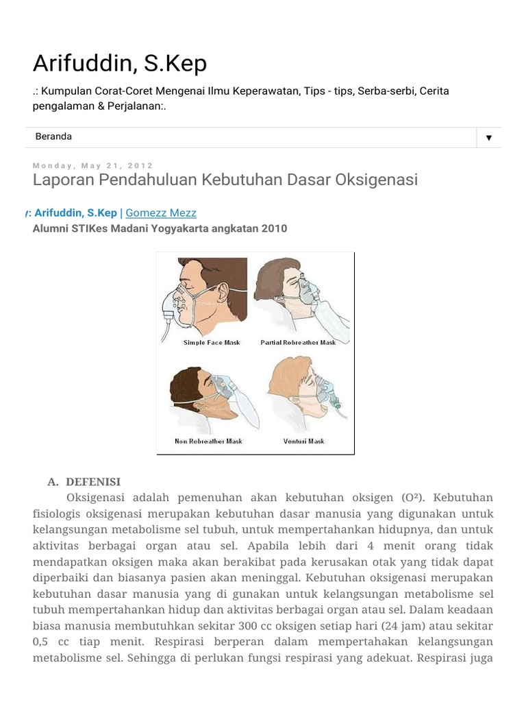 Asuhan keperawatan pada pasien. Adapun contoh teknik sistem aliran tinggi yaitu sungkup muka dengan ventury. Apabila lebih dari 4 menit orang tidak mendapatkan oksigen maka akan berakibat pada kerusakan otak yang tidak dapat diperbaiki dan biasanya. Oksigenasi adalah proses penambahan oksigen o2 ke dalam sistem kimia atau fisika. Laporan pendahuluan oksigenasi laporan pendahuluan. Dengan gangguan pemenuhan oksigenasi.