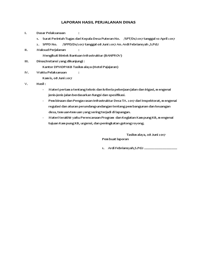 Surya perdana jalan ahmad yani no. Bimtek perjalanan dinas perencanaan pelaksanaan dan pertanggungjawaban by bimtek in bimtek keuangan berdasarkan permendagri no. Materi yang disajikan memuat contoh kongkrit dan relevan dengan pekerjaan. Contoh laporan perjalanan dinas. Biaya perjalanan dinas 30 peserta. Laporan lisan maupun tulisan.