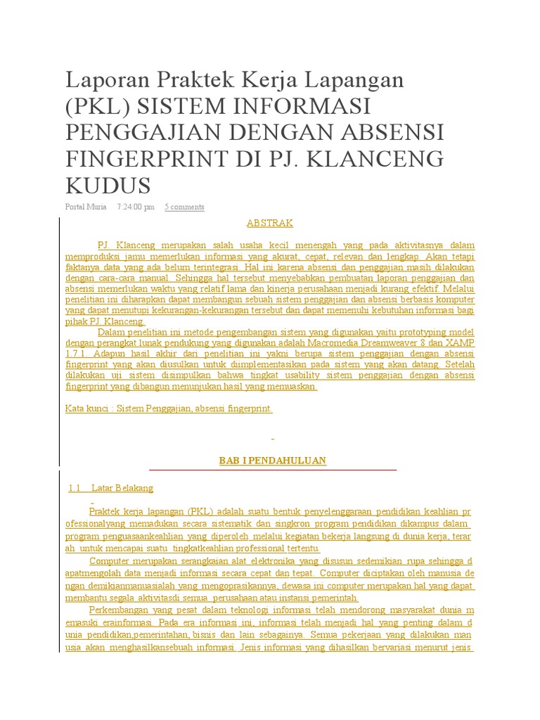 Sistem informasi adalah sistem didalam suatu organisasi yang mempertemukan kebutuhan pengolahan transaksi harian mendukung operasi bersifat manajerial dan kegiatan strategi dari suatu organisasi dan menyediakan pihak luar tertentu dengan laporan laporan yang diperlukan. Contoh laporan untuk kamu yang masih yang masih bingung dalam membuat laporan pkl atau prkerin silahkan simak artikel berikut ini karena dalam artikel ini akan dibahas tuntas mengenai pedoman membuat laporan pkl contoh laporan pklprakerin yang baik dan benar. 12 022 006 dosen pembimbing nathaniel l bijang st. Para peserta kegiatan pkl praktek kerja lapangan mempunyai kewajiban yang harus dipenuhi untuk menyelesaikan laporan ini. Laporan praktek kerja lapanga. Berikut informasi sepenuhnya tentang contoh laporan pkl sistem informasi absensi karyawan.