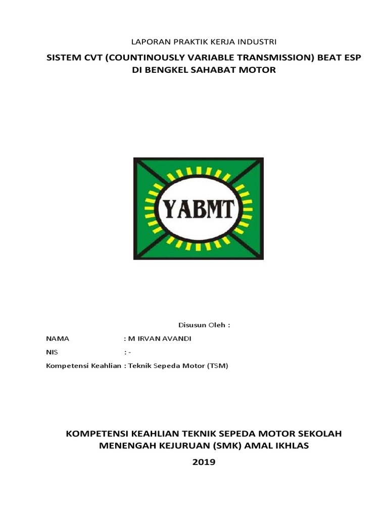 Contoh laporan prakerin tsm tentang cvt. Puji syukur penulis panjatkan kehadirat allah swt yang telah melimpahkan rahmat serta hidayah nya sehingga penulis dapat menyusun laporan hasil pelaksanaan prakerin yang telah penulis laksanakan pada dunia usaha kurang lebih tiga bulanadapun penyusunan laporan prakerin ini di maksudkan untuk memenuhi salah satu syarat untuk mengikuti ujian nasional berbasis computer di smk pena nugraha indonesia. Para peserta kegiatan pkl praktek kerja lapangan mempunyai kewajiban yang harus dipenuhi untuk menyelesaikan laporan ini. Laporan prakerin cvt perawatan dan perbaikan system cvt continus variable transmisi pada sepeda motor yamaha mio gt 2014. Demikian contoh laporan praktek kerja industri cvt semoga bermanfaat bagi sobat yang membutuhkan. Laporan prakerin tsm minggu 08 september 2019. Contoh laporan prakerin tsm teknik sepeda motor 2016 video lucu euro truck simulator 2.