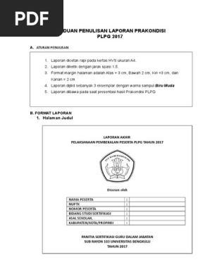 Adapun format laporan akhir tersebut bisa anda lihat pada coretan kami berikut ini. Demikian laporan akhir kegiatan pembekalan prakondisi plpg 2017 ini dibuat semoga laporan ini bisa bermanfaat khususnya bagi peserta sertifikasi guru. Contoh laporan prakondisi bentuk word peta konsep dan powerpoint materi penilaian baca ringkasan model model pembelajaran baca pedoman merevisi dan contoh revisi laporan prakondisi plpg 2017 baca 125 soal pedagogik persiapan utn. Laporan akhir pembekalan plpg merupakan laporan yang harus dipersiapkan oleh calon peserta plpg tahun 2017. Sistematika laporan akhir pembekalan plpg tahun 2017 1. Laporan akhir pembekalan plpg merupakan laporan yang harus dipersiapkan oleh calon peserta plpg tahun 2017.