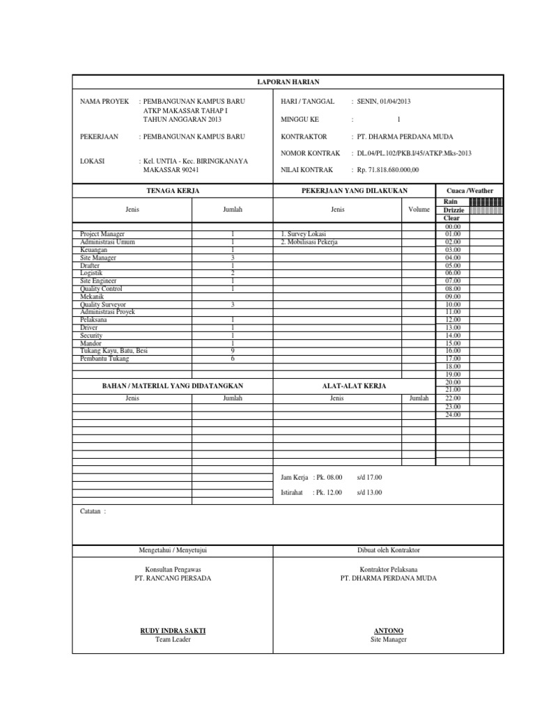 Dengan adanya laporan ini maka proses pelaksanaan pekerjaan dapat diarsipkan. Selamat datang halaman blog ini menyediakan file file contoh format laporan harian mingguan bulanan ataupun laporan pendahuluan dan akhir dari suatu proyek konstruksi atau perencanaan proyek konstruksi serta format format formulir proyek lainnya yang mungkin anda butuhkan dalam pekerjaan proyek atau pengelolaan sebuah proyek manajemen proyek maupun untuk keperluan literatur pembuatan. Laporan harian ini memuat tentang tenaga kerja material item pekerjaan progress dan volume pekerjaan serta data cuaca di lapangan. Laporan ini di buat oleh konsultan untuk memantau perkembangan progress kegiatan lapangan kegiatan proyek agar selesai tepat waktu. Academiaedu is a platform for academics to share research papers. Laporan harian mingguan dan bulanan proyek menjadi salah satu syarat administrasi teknis yang harus dibuat oleh kontraktor pelaksana pekerjaan proyek.