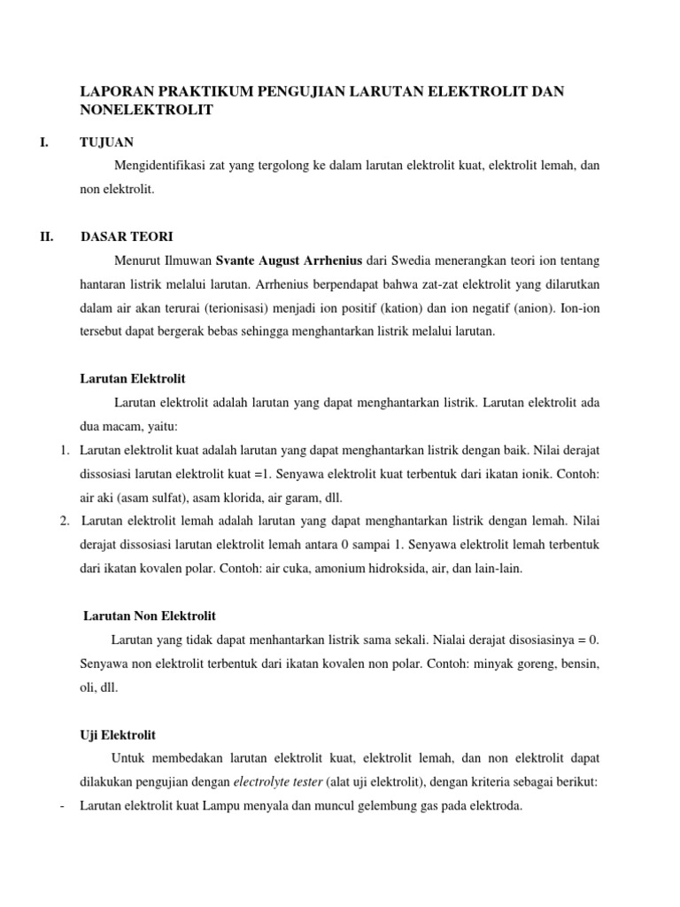 Contoh soal larutan elektrolit dan non elektrolit pilihan ganda larutan elektrolit merupakan suatu zat yang ketika dilarutkan dalam air akan menghasilkan larutan yang dapat menghasilkan arus listrik. Pada pengujian larutan non elektrolit lampu tidak dapat menyala dan gelembung gas tidak ada. Dan hal ini lah yang akan membuat lampu menjadi tidak dapat menyala. Contoh larutan elektrolit lemah. Asam lemah hcn h3po4 ch3cooh dan c2o3 basa lemah nh4oh aloh3 dan feoh3. Demikian pembahasan tentang pengertian larutan elektrolit contoh larutan elektrolit dan ciri ciri larutan elektrolit mohon maaf jika ada kesalahan dalam penulisan dan pembahasan.