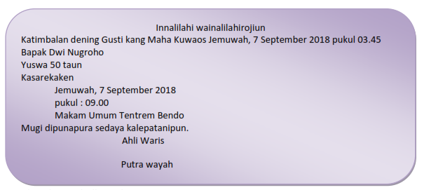 File obituary ini dibuat dalam format doc microsoft office untuk memudahkan modinpetugas kelurahan pak rt ataupun ketua karang taruna dalam pembuatan pengumuman berita duka cita pada lingkungannya apabila terjadi. Winantu ing bagya mulya.