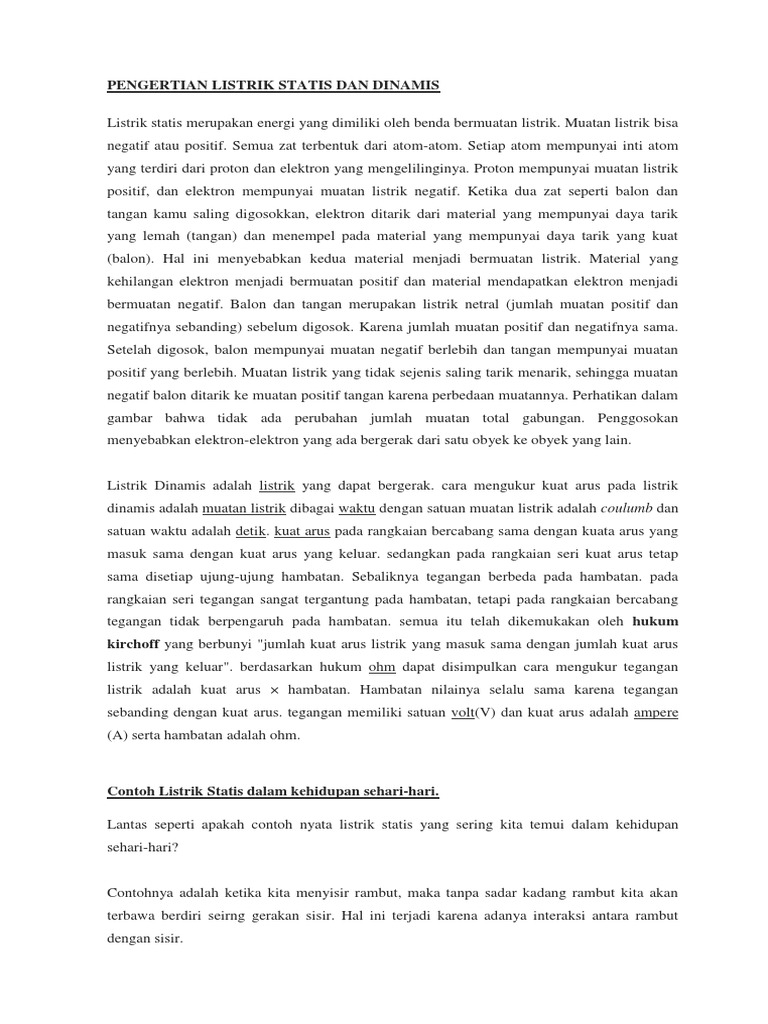 Pengertian persamaan perbedaan rumus contoh soal. Listrik statis adalah kelistrikan yang berhubungan dengan gejala kelistrikan yang diam dan tidak mengalir. Berikut ini kita akan membahas secara lengkap mengenai listrik statis. Pengertian listrik statis dan dinamis secara tersendiri akan saya bahas masing masing di paragraf selanjutnyasebelumnya sebagai pengantar mungkin kita baiknya tau dulu bahwa listrik statis dan listrik dinamis merupakan dua jenis dari energi listrik. Listrik statis adalah listrik yang diam dan listrik dinamis adalah listrik yang bergerak mengalir. Muatan listrik muncul karena adanya perpindahan elektron dari satu benda ke benda lain.