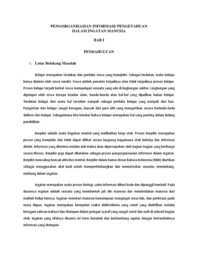 Contoh makalah pengorganisasian informasi pengetahuan dalam ingatan manusia. Pengolahan informasi merupakan perluasan dari bidang kajian ranah psikolog. Bermacam macam jenis ingatan juga ada dalam otak manusia. Selama otak dalam keadaan sehat manusia akan selalu melakukan proses mengingat. 1 faktor individu dimana proses mengingat akan lebih efektif apabila individu memiliki minat yang besar motivasi yang kuat memiliki metode tertentu dalam pengamatan dan pembelajaran memiliki kondisi fisik dan kesehatan. Asep nur ajiyati spd bab i pendahuluan. Berkenaan dengan itu kami sebagai penulis akan membahas tentang apa itu ingatan memori teori teori ingatan yang dikemukakan oleh para ahli psikologi bermacam macam ragam ingatan gangguan ingatan pada manusia hubungan ingatan dan iq dan cara meningkatkan daya ingat.