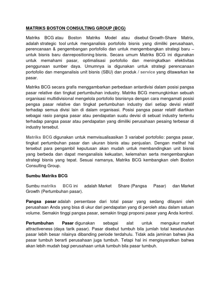 Bcg adalah kepanjangan dari boston consulting group merupakan perusahaan konsultan manajemen yang didirikan pada tahun 1963 dan memiliki 87 kantor di 45 negara termasuk indonesia. Bruce henderson dari boston consulting group bcg mengembangkan sebuah model untuk mengelola portofolio dari berbagai unit bisnis strategis sbu atau lini produk utama. Oleh karena itu kelancaran suatu perusahaan sangat tergantung pada manajemen dalam menyusun strategi pemasaran yang akan datang baik dalam jangka pendek maupun. Pengertian analisis matriks bcg dan contohnya matriks bcg atau bcg matrix adalah alat analisis bisnis yang digunakan untuk membantu perusahaan dalam mempertimbangkan peluang pertumbuhan dengan perencanaan strategis jangka panjang dan meninjau portofolio produk perusahaan tersebut agar dapat mengambil keputusan untuk berinvestasi mengembangkan atau menghentikan produknya. Analisis industri pada perusahaan manufaktur pt hm sampoerna tbk. Boston consulting group bcg merupakan perusahaan konsultasi manajemen global yang terkenal dan pernah dinobatkan sebagai pengembang terbaik dari ketiga versi forbes pada tahun 2014.