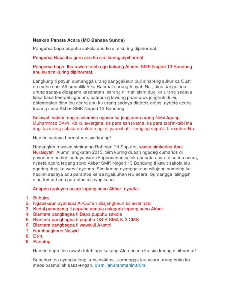Terbaru terupdate 2019 17 agustus bahasa sunda isra miraj materi maulid nabi mc bahasa sunda panata acara paturay tineung pembawa acara pidato bahasa sunda protokol sunda teks protokol sunda ulang tahun contoh teks panata acara dalam bahasa sunda. Contoh teks mc pembawa acara perpisahan sekolah dengan bahasa sunda embara kabalarea bewara kanu araya kanca baraya nu pada lengah sugri pribumi nu pada linggih mugia mugi janten uninga wirehing dina dinten ieu pisan kemis 11 juni 2019.