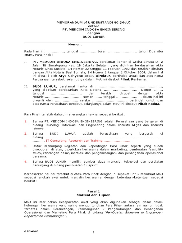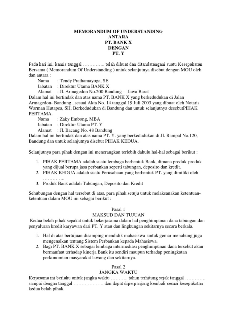 Fb twitter wa line pinterest g linkedin. Contoh memorandum of understanding mou 1413 mr sono 10 comments. Mou atau memorandum of understanding merupakan sebuah surat yang digunakan untuk melakukan kerjasama dari kedua belah pihak yang berbeda. Memorandum of understanding sering kali disebut sebagai mou yang digunakan dalam memulai perjanjian untuk kepentingan tertentu. Nota ini dibuat sebagai langkah awal dalam membuat kontrak kerjasama perjanjian untuk mengikan kedua pihak yang bekerjasama. Sebelum kita memasuki pembahasan inti saya akan mengulas terlebih dahulu pengertian dan tujuan dibuatnya mou ini.