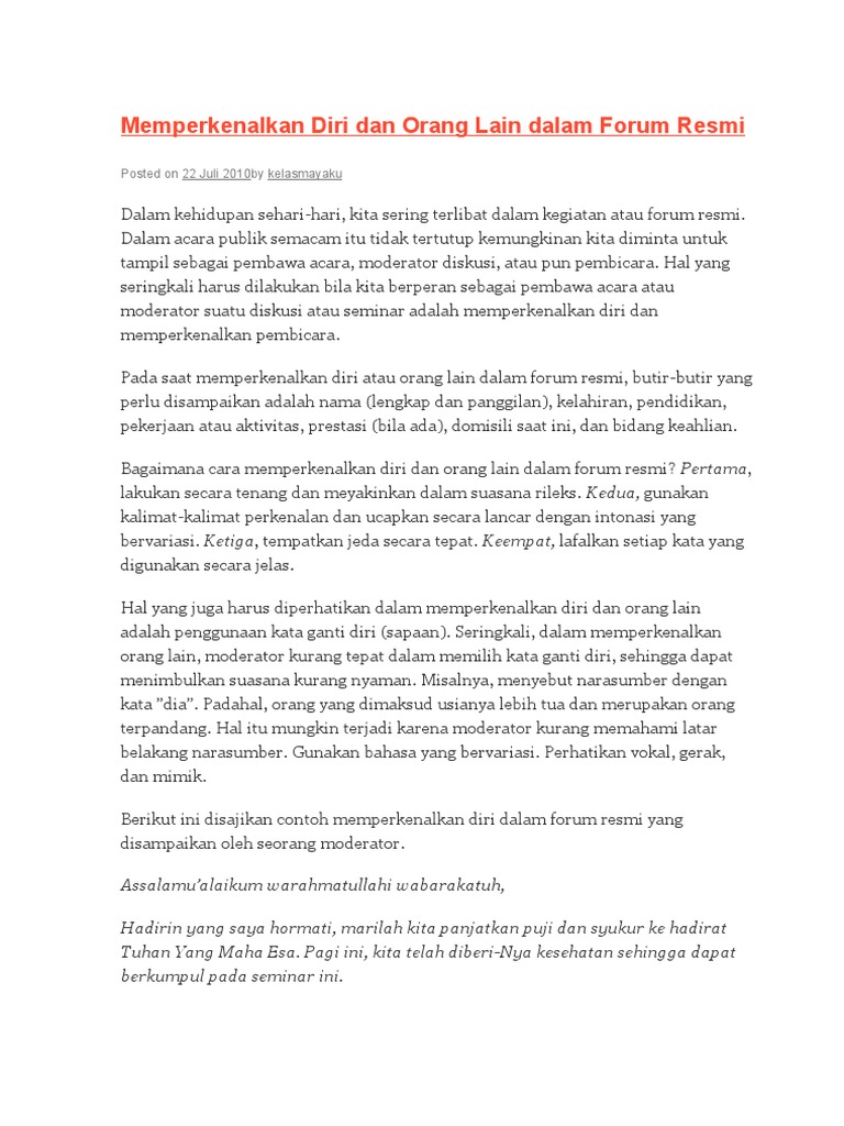 Contoh memperkenalkan diri dalam forum resmi. Dalam kegiatan tersebut anda juga dapat memperkenalkan orang lain misalnya pembicara atau pemateri notulis dan moderator. Perhatikan contoh pembicaraan yang diucapkan. Dalam kegiatan tersebut anda juga dapat memperkenalkan orang lain misalnya pembicara atau pemateri notulis dan moderator. Perhatikan contoh pembicaraan yang diucapkan. Karena itu dalam diskusi masing masing pihak harus dapat menjaga sikap etika mereka sehingga tidak menyinggung perasaan orang lain. Selamat pagi izinkan saya untuk memperkenalkan diri saya nama saya diana puspita sari.