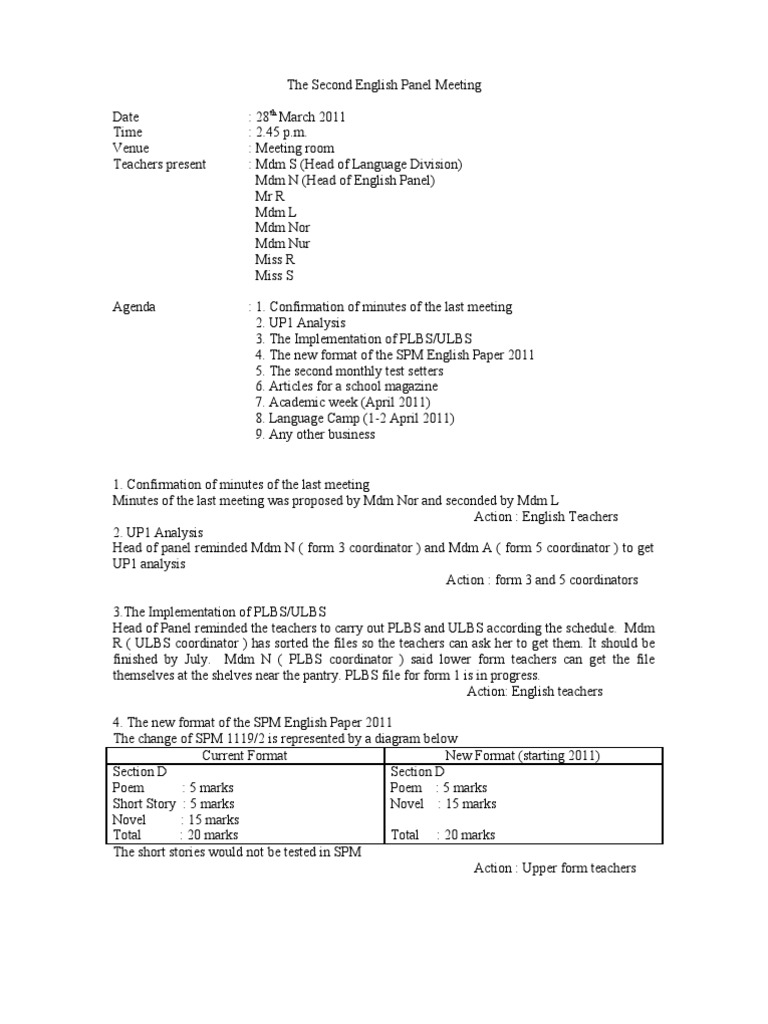 You can also take note of the following points while preparing a minute of meeting. Berikut disertakan cara buat dan contoh minit mesyuarat yang berkualiti lengkap dan mudah beserta maklumat format dan contoh. Use the minutes of meeting template for notetaking during the meeting or to organize your notes before sending. Minit mesyuarat atau minutes of meeting mom adalah penting dalam sesebuah mesyuarat kerana ia akan menjadi panduan dan rujukan buat pekerja dan orang yang hadir atau tidak untuk mengetahui hasil keputusan sesuatu mesyuarat. Catatan rapat dapat menunjukkan efisiensi serta efektivitas rapat yang telah berlangsung sekaligus bertindak sebagai pengingat mengenai apa saja yang telah dibahas atau yang harus dibahas pada pertemuan selanjutnya. Rafiriandi nasution se mt direktur pengembangan hendri pangestu samosir kepala unit kolam deli dan gelanggang arief ardian daulay ssos pimp.