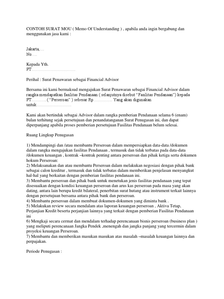 Contoh mou antar perusahaan. Surat mou memang ada kemiripan dengan contoh surat perjanjian namun isi dari mou lebih ditekankan ke landasan kepastian bisa diibaratkan ada sebuah perusahaan menginginkan dana untuk kemajuan produksi dan perusahaan tersebut sudah sangat yakin akan meningkatnya produksi jika disuntik dengan dana yang ditetapkan maka surat mou ini bisa dijadikan sebagai landasan untuk mendapatkan dana dari. Perjanjian antar dua pihak ini biasa dikenal dengan istilah memorandum of understanding mou. Memorandum of understandingnota kesepahaman antara pt. Berikut adalah contoh mou kerjasama antar perusahaan dalam ruang lingkup kerjasama keuangan. Membuat mou dengan kelompok tani. Hal ini sebenarnya bukan hal yang baru lagi dimana setiap perusahaan tentu ingin bekerjasama dengan perusahaan perusahaan lain agar bisa saling menguntungkan.
