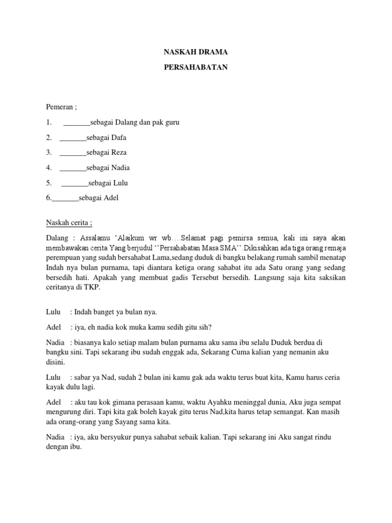 Contoh naskah drama 14 orang tentang persahabatan. Teater persahabatan lucu komedi 3 5 6 7 8 9 orang untuk pembahasan kali ini kami akan mengulas mengenai naskah drama yang dimana. Teater persahabatan lucu komedi 3 5 6 7 8 9 orang untuk pembahasan kali ini kami akan mengulas mengenai naskah drama yang dimana. Suatu ketika disaat keadilan sudah menjadi kata yang punah. 14 contoh naskah drama. Contoh naskah drama. Beberapa contoh dari jenis jenis drama sudah pernah dipublikasikan di beberapa artikel sebelumnya.