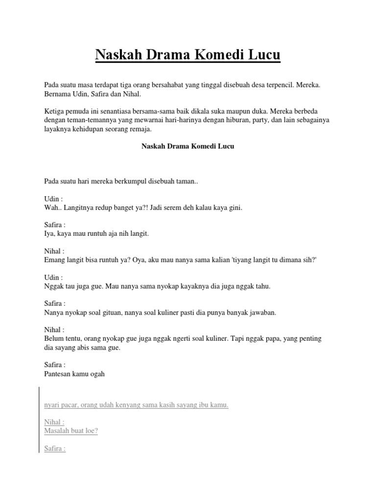Bernama toha siska dan aldi. Pada suatu masa terdapat tiga orang bersahabat yang tinggal disebuah desa terpencil. Naskah drama yang pertama yang akan dipublikasikan kepada anda adalah tentang contoh naskah drama komedi. 14 contoh naskah drama. Teater persahabatan lucu komedi 3 5 6 7 8 9 orang untuk pembahasan kali ini kami akan mengulas mengenai naskah drama yang dimana. Contoh naskah drama komedi singkat terbaru naskah drama adalah sebuah tulisan yang berisikan dialog serta arahan cerita yang berfungsi sebagai acuan bagi para pemeran dalam menjalankan lakon terhadap jalannya cerita dramasedangkan naskah drama komedi adalah naskah yang di dalamnya berisikan dialog dialog lucu yang nantinya akan dibawakan oleh pemeran dengan konsep pementasan dengan.