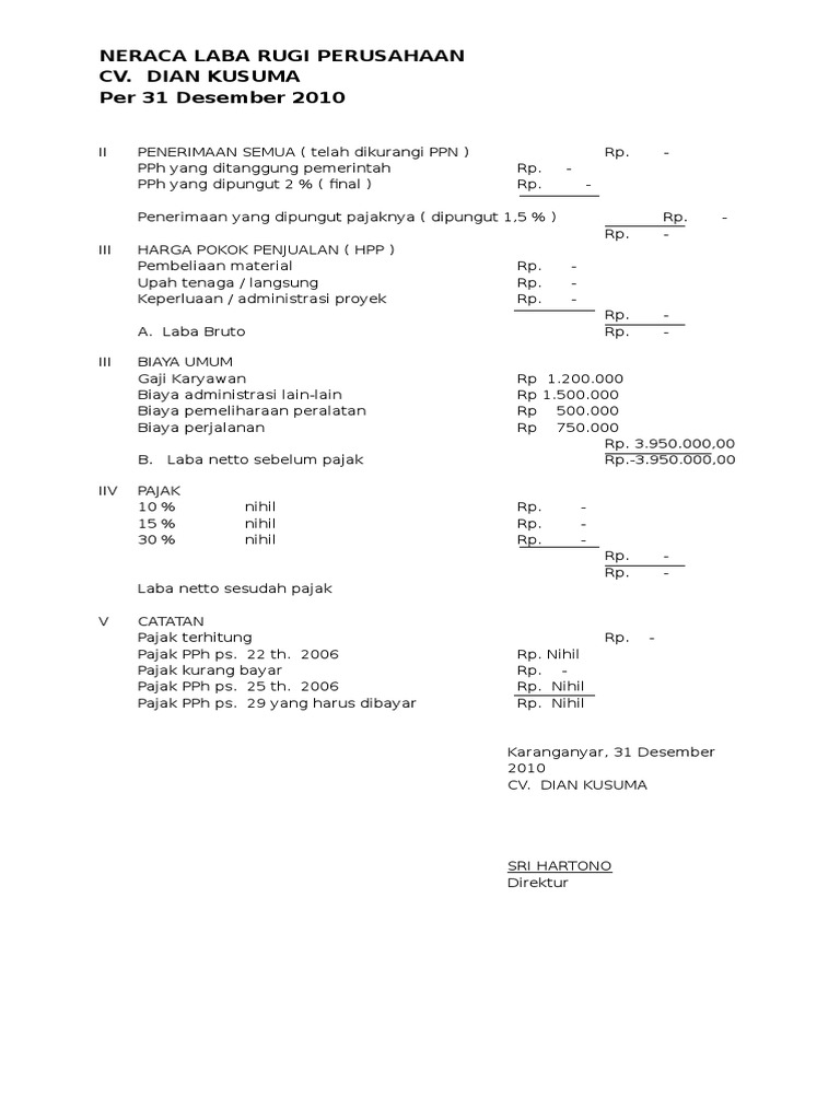 Spt nihil pajak cv. Laporan laba rugi profit and lost statement yang disusun oleh perusahaan mempunyai unsur pendapatan serta seluruh beban pada periode berjalan suatu perusahaanselengkapnya tentang laporan laba rugi laporan laba rugi adalah laporan yang menunjukkan jumlah pendapatan dan biaya dalam satu periode usahabisnis. Ok itulah model dan bentuk neraca keuangan akuntansi. Contoh format laporan keuangan neraca gambar 1. Cuma yang membedakan dalam neraca lajur informasi yang di hasilkan masih kurang detail yang mana rugi laba usaha tidak terbaca dengan baik walau hasilnya sudah kita ketahui. Contoh format laporan keuangan laba rugi gambar 2.
