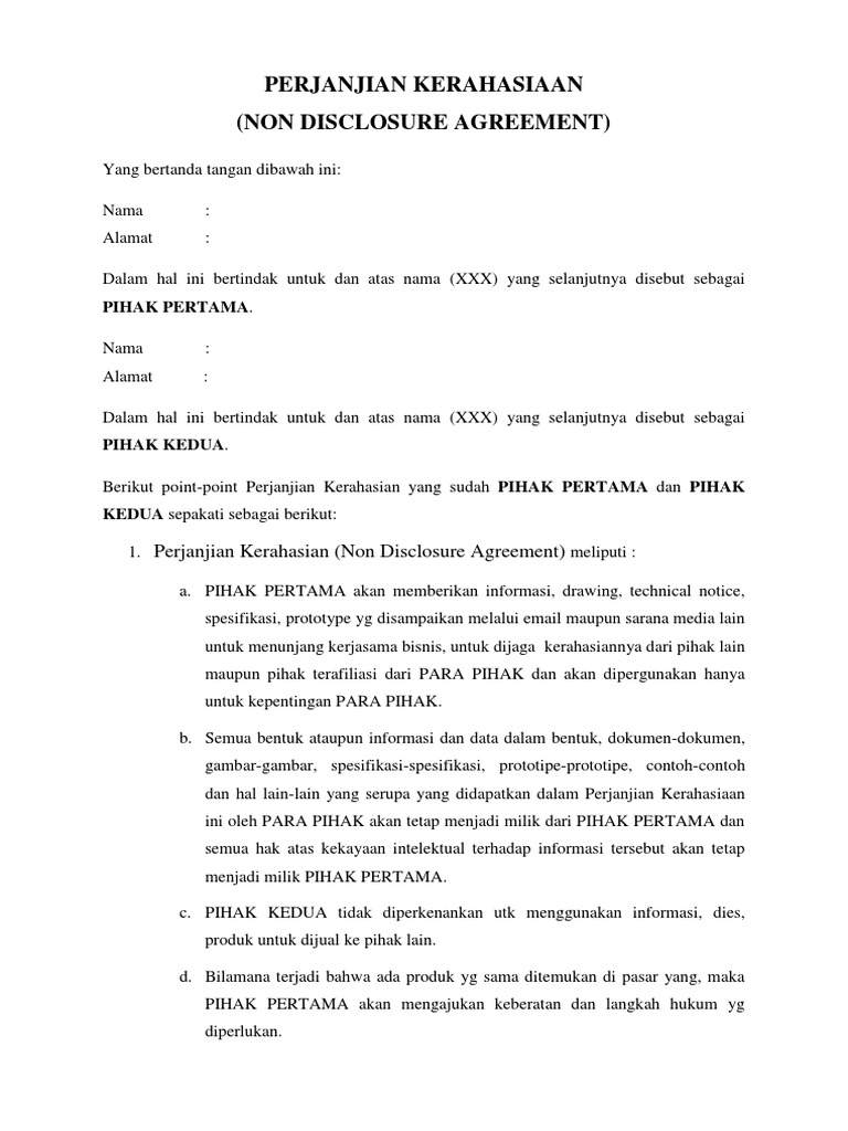 Surat non disclosure agreement atau yang biasa disingkat dengan nda adalah salah satu jenis dari surat perjanjian yang menyatakan bahwa seseorang tidak boleh melakukan pengutipan atau pemberitahuan isi dalam sebuah pekerjaan disclosure seperti yang tertera dalam surat perjanjian tersebutsecara ringkas surat non discolusre agreement memuat perjanjian yang menuyatakan bahwa seseorang diminta. Seorang dokter atau pihak rumah sakit yang memiliki akses informasi mengenai pasiennya maka mereka terikat dalam perjanjian nda ini. This confidentiality agreement this agreement dated as of 2011 is made by and between ltd a company incorporated under the laws of a nd having its office located at company and recipient and pt. Contoh perjanjian kerahasiaan non disclosure agreement kesepakatan untuk melakukan kerjasama yang dituangkan dalam sebuah perjanjian kerjasama terkadang membutuhkan perjanjian pelengkapturunan guna mengatur secara khusus klausula tertentu. A non disclosure agreement nda or confidentiality agreement is a legally binding contract which protects trade secrets or other sensitive information from being revealed. Non disclosure agreements are legal contracts that prohibit someone from sharing information deemed confidential.